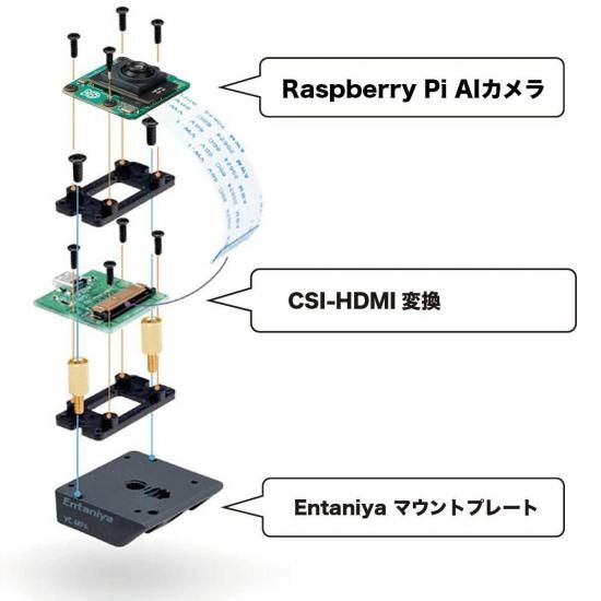 ラズベリーパイ用 AIカメラにCSI-HDMI変換モジュールを使用して、HDMI接続できるようにしたカメラをマウントプレートに組み込んだカメラです。